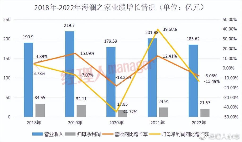 从近5年的业绩数据来看,2019年,海澜之家增收不增利,2020年业绩进一步恶化、营业净利双双下滑,到了2021年,业绩有所恢复,但是到了2022年,公司业绩再次下滑,而且营业收入总额比2018年还要少,归母净利润也是呈现整体下滑趋势,而且比2018年少了12.98亿元。