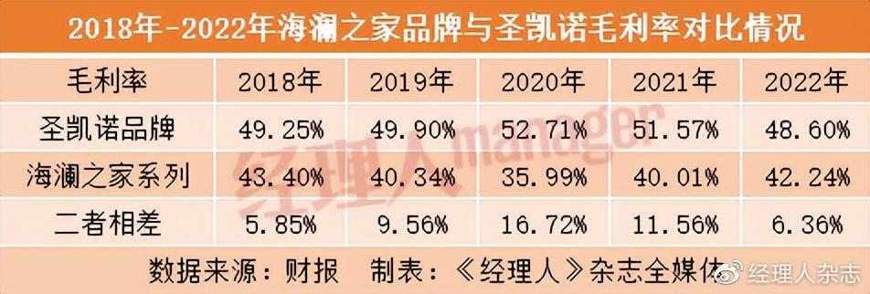 不过,从职业装品牌圣凯诺的发展情况来看,其有望成为公司新的增长曲线。从毛利率来看,圣凯诺的毛利率比海澜之家的要高出不少,2018年至2022年,前者的毛利率分别为49.25%、49.90%、52.71%、51.57%、48.60%,后者的毛利率为43.40%、40.34%、35.99%、40.01%、42.24%,可见圣凯诺的毛利率比海澜之家大致高出5到16个百分点,对公司的利润贡献值较大。