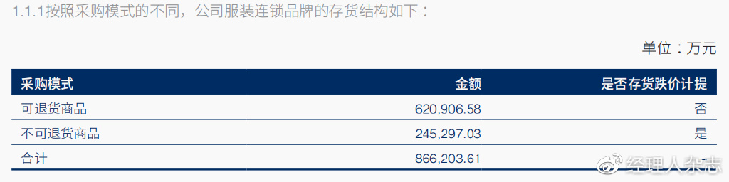 根据海澜之家的运营模式,其存货存在可退货和不可退货模式。以公司服装连锁品牌的存货结构为例,86.62亿元存货中,有62.09亿元为可退货商品,有24.53亿元为不可退货商品。不可退货商品库龄1年内的不计提跌价准备;1-2年的账面余额为9.07亿元,共计提1.95亿元跌价准备;2年以上的账面余额7.66亿元,共计提7.34亿元,计提比例高达95.82%。