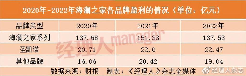 然而,市场反馈来看,除了海澜之家主品牌,公司的其他品牌在市场上并未创造较大的营收,品牌存在感较低。从公司各品牌盈利情况来看,2020年至2022年,海澜之家系列营业收入分别为137.68亿元、151.33亿元、137.53亿元,圣凯诺品牌营业收入分别为20.71亿元、22.60亿元、22.47亿元,其他品牌营收情况并没有单独划分,统一归类为其他品牌,总营收分别为16.06亿元、20.42亿元、19.04亿元。可以看出,海澜之家系列的营收是公司收入的核心来源。而职业装、女装、童装等其他品牌,除了职业装品牌圣凯诺的收益比较好外,其他品牌的发展无异于蜻蜓点水。