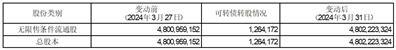 ● 未转股可转债情况:截至2024年3月31日,除已回售的可转债外尚未转股的可转债金额为5,637,000元,占可转债发行总量的0.1879%,占扣除已回售的可转债后发行的可转债数量的0.1911%。