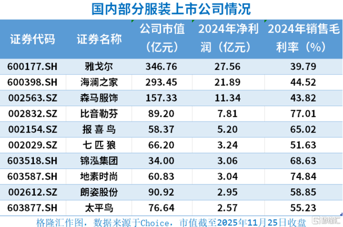 值得注意的是,2025年前三季度,海澜之家、雅戈尔、森马服饰、比音勒芬等服装企业的归母净利润均有下滑。