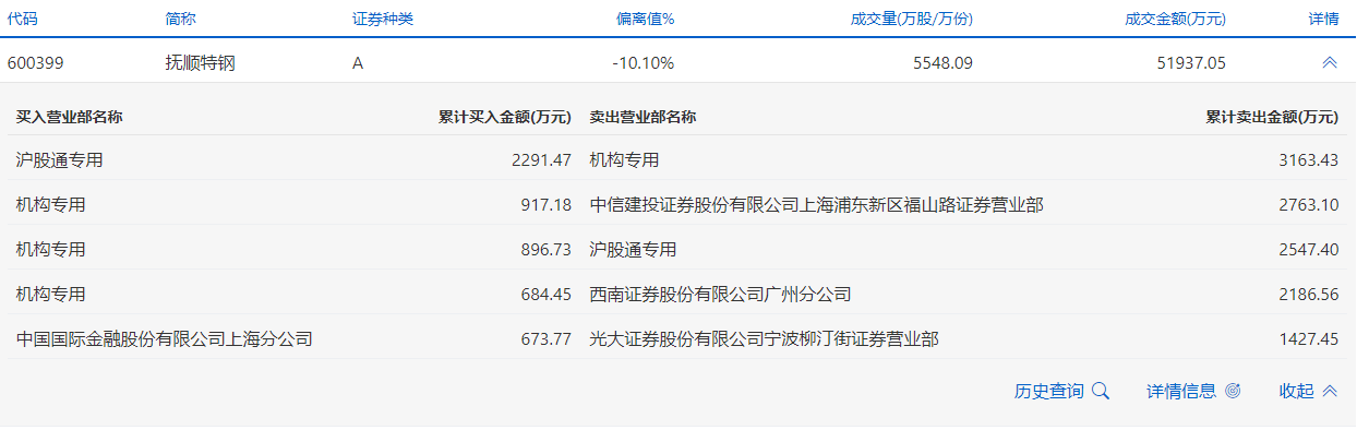 5月30日,抚顺特钢今日跌停,龙虎榜数据显示,上榜营业部席位全天成交1.76亿元,占当日总成交金额比例为33.79%。其中,买入金额为5463.61万元,卖出金额为1.21亿元,合计净卖出6624.34万元。