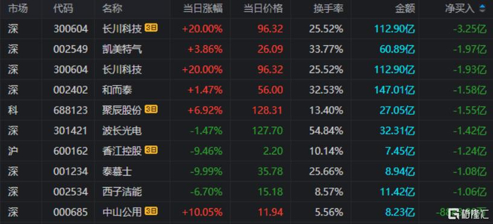 龙虎榜单日净卖出额前三为凯美特气、长川科技、和而泰,分别为1.97亿元、1.93亿元、1.58亿元。