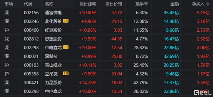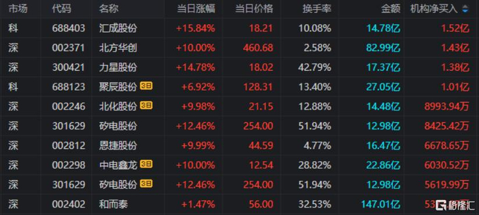 龙虎榜中涉及机构专用席位的个股中,当日净买入额前三为汇成股份、北方华创、力星股份,分别为1.52亿元、1.43亿元、1.38亿元。