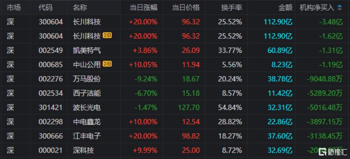 龙虎榜中涉及机构专用席位的个股中,当日净卖出额前三为长川科技、凯美特气、万马股份,分别为3.48亿元、1.31亿元、9048.88万元。
