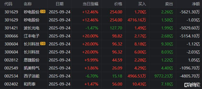 长川科技今日涨停,换手率25.52%,成交额112.90亿。龙虎榜数据显示,深股通专用席位买入6亿元并卖出8.03亿元,2机构净卖出3.48亿元,中山东路净卖出1.81亿元,陈小群买入8395.61万元、卖出1.96亿元。