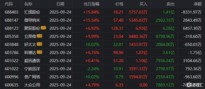 在龙虎榜中,涉及沪股通专用席位的个股有9只,汇成股份的沪股通专用席位净卖出额最大,净卖出8331.97万元。
