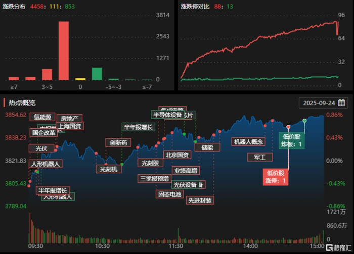 9月24日,沪指涨0.83%,深成指涨1.80%,创业板指涨2.28%。沪深两市成交额2.33万亿,全市场超4400只个股上涨。存储芯片、光刻机、能源金属等板块上涨,旅游等板块跌幅居前。