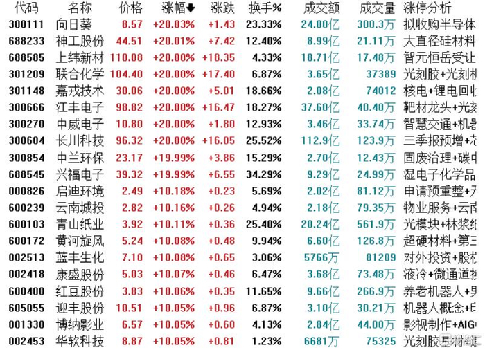焦点股方面,芯片产业链全线爆发,华软科技4连板、向日葵20CM3连板、长川科技20CM2连板;机器人概念反复活跃,红豆股份5天4板、联美控股3连板、迎丰股份2连板。