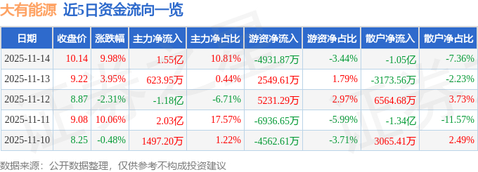 证券之星消息,大有能源11月14日涨停收盘,收盘价10.14元。该股于10点49分涨停,4次打开涨停,截止收盘封单资金为3686.19万元,占其流通市值0.15%。