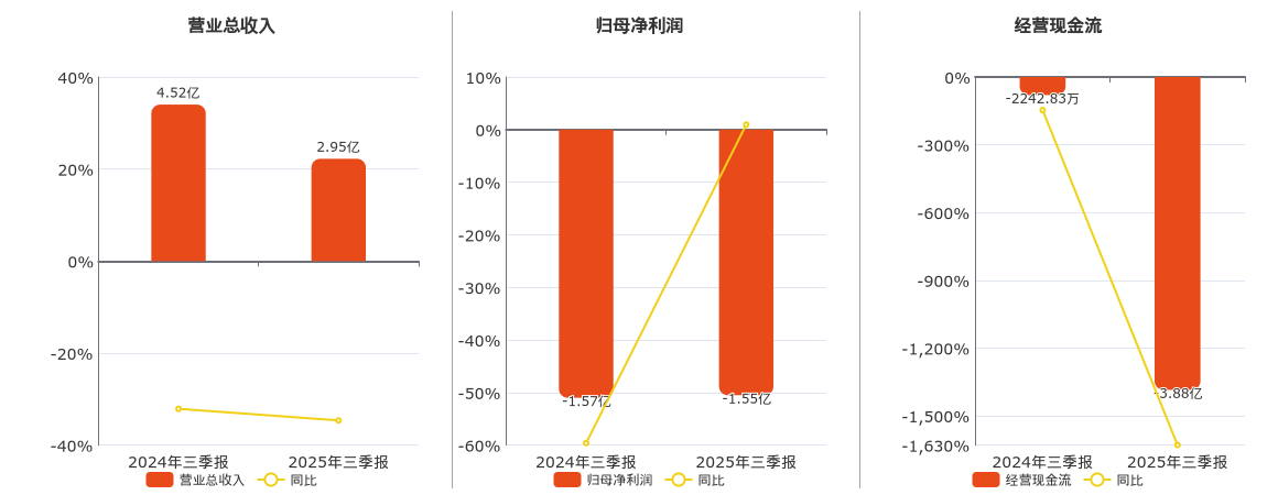 公司营业总收入为2.95亿元,在已披露的同业公司中排名第26,较去年同报告期营业总收入减少1.57亿元,同比较去年同期下降34.64%。归母净利润为-1.55亿元,在已披露的同业公司中排名第30。经营活动现金净流入为-3.88亿元,在已披露的同业公司中排名第28,较去年同报告期经营活动现金净流入减少3.66亿元。