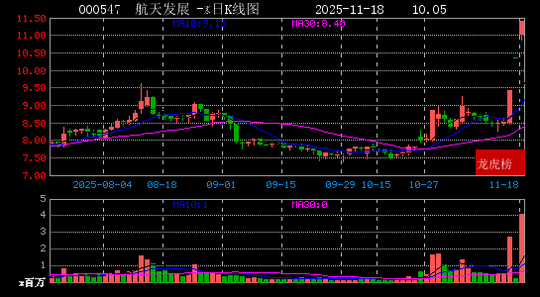 截止收盘,航天发展报收11.39元/股,涨幅10.05%,成交量409万手,成交额45.97亿元,换手率25.76%。今日3板。