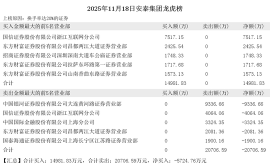 【汇总】合计买入:14981.83万元,合计卖出:20706.59万元,净买入:-5724.76万元。