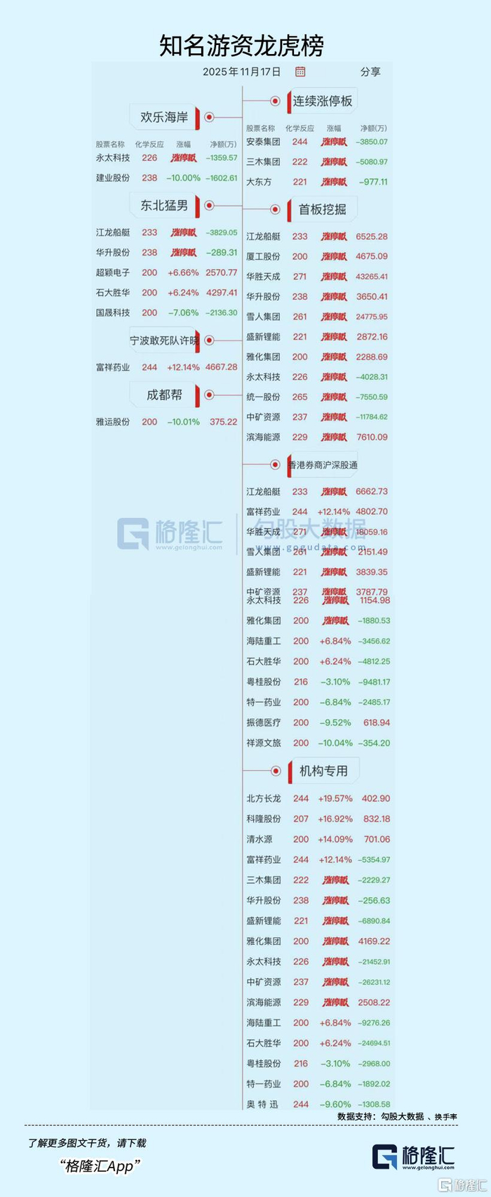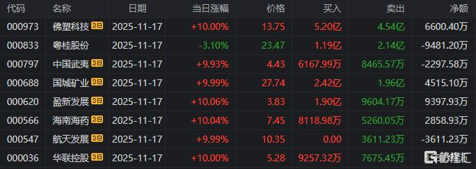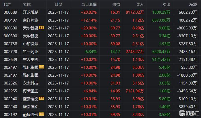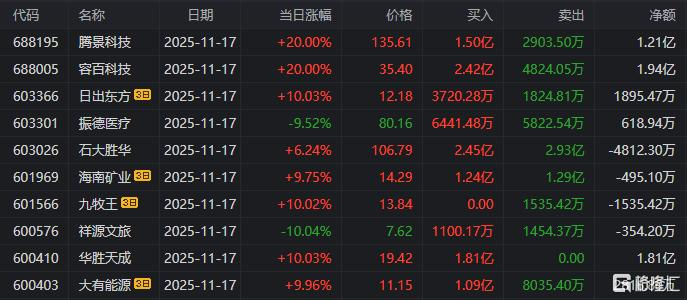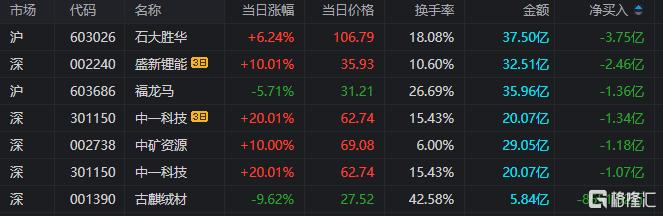 龙虎榜单日净卖出额前三为石大胜华、福马龙、中矿资源,分别为3.75亿元、1.36亿元、1.18亿元。