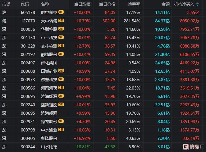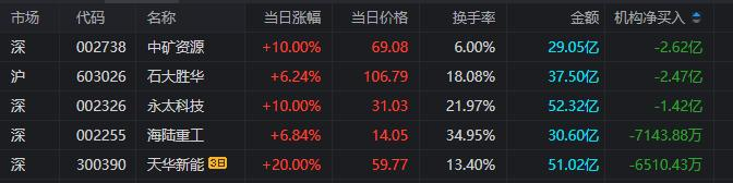 龙虎榜中涉及机构专用席位的个股中,当日净卖出额前三为中矿资源、石大胜华、永太科技,分别为2.62亿元、2.47亿元、1.42亿元。