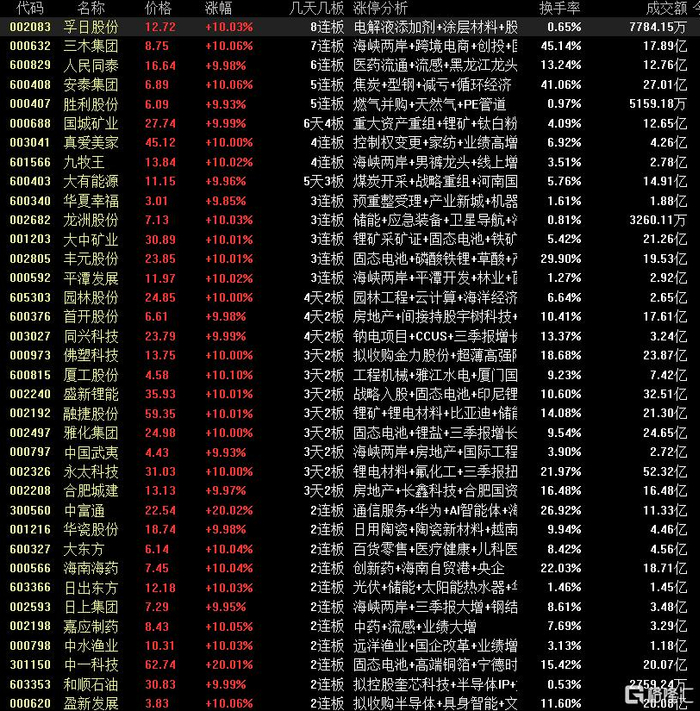 焦点股方面,福建本地股平潭发展22天14板、三木集团11天8板,锂电池板块孚日股份8连板、大中矿业14天7板。此外,煤炭股安泰集团上演“准天地天板”走出23天14板。
