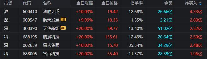 龙虎榜单日净买入额前三为华胜天成、腾景科技、雪人集团,分别为4.33亿元、2.50亿元、2.48亿元。