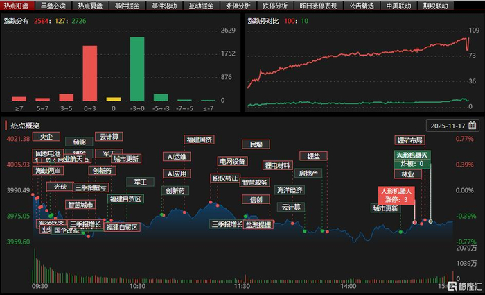 11月17日,A股主要指数集体下跌,全市场成交额1.93万亿元,较前一交易日缩量501亿元。