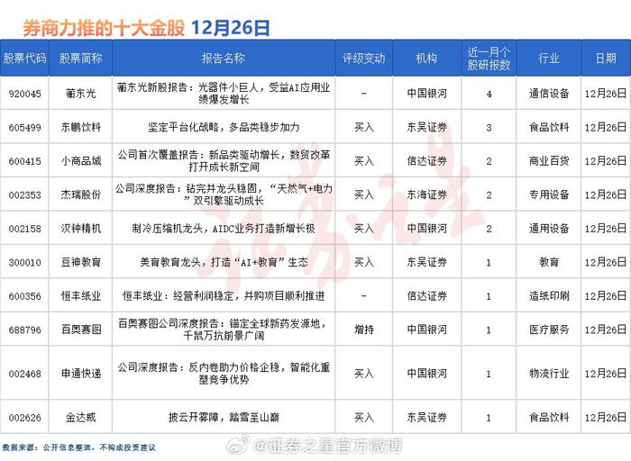 12月26日券商力推股出炉,蘅东光、东鹏饮料、小商品城居前三