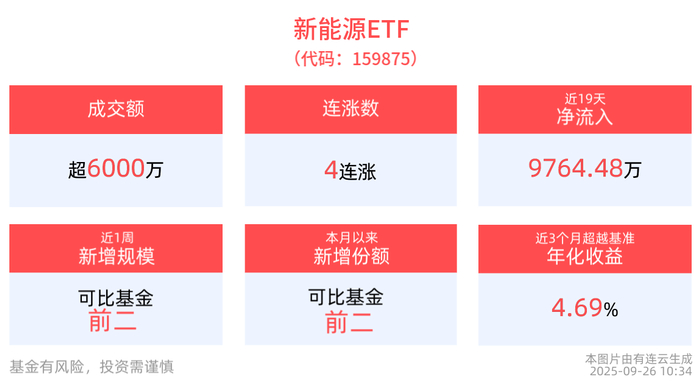 截至2025年9月26日10:34,中证新能源指数上涨0.66%,成分股日月股份、湘电股份、明阳智能纷纷10cm涨停,天顺风能上涨6.06%,湖南裕能上涨6.04%。新能源ETF(159875)上涨0.78%,冲击4连涨。拉长时间看,截至2025年9月25日,新能源ETF近1周累计上涨5.10%。