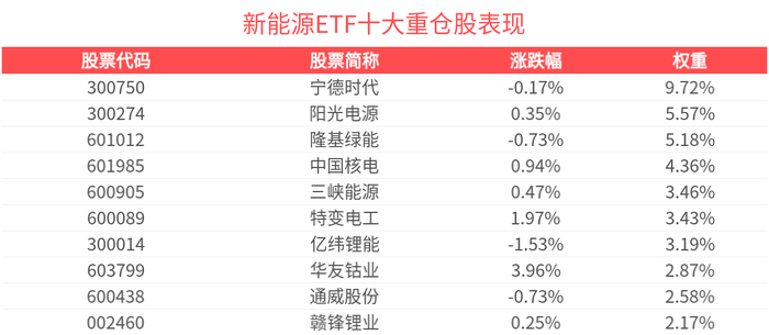 数据显示,截至2025年8月29日,中证新能源指数前十大权重股分别为宁德时代、阳光电源、隆基绿能、中国核电、特变电工、亿纬锂能、华友钴业、三峡能源、通威股份、天齐锂业,前十大权重股合计占比42.78%。
