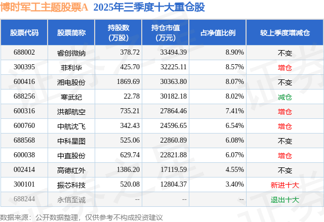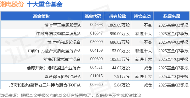 根据2025基金Q3季报公募基金重仓股数据,重仓该股的公募基金共8家,其中持有数量最多的公募基金为博时基金的博时军工主题股票A。博时军工主题股票A目前规模为24.48亿元,最新净值2.066(12月30日),较上一交易日上涨0.49%,近一年上涨46.52%。该公募基金现任基金经理为曾鹏。曾鹏在任的基金产品包括:博时新兴成长混合,管理时间为2013年1月18日至今,期间收益率为225.93%;博时特许价值混合A,管理时间为2018年6月21日至今,期间收益率为297.49%;博时沪港深优质企业基金A,管理时间为2021年1月20日至今,期间收益率为-8.18%;