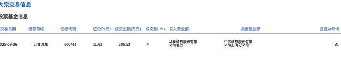 9月26日,江淮汽车大宗交易成交4万股,成交额206.52万元,占当日总成交额的0.05%,成交价51.63元,较市场收盘价51.63元持平。