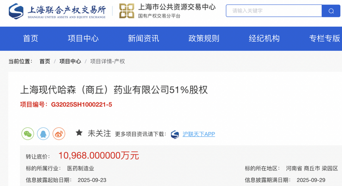 瑞财经 刘治颖9月23日,上海现代制药股份有限公司挂牌转让上海现代哈森(商丘)药业有限公司51%股权,转让底价约1.1亿元,信息披露期满日期为2025-09-29。
