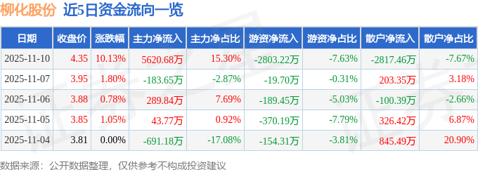 证券之星消息,柳化股份11月10日涨停收盘,收盘价4.35元。该股于9点52分涨停,5次打开涨停,截止收盘封单资金为877.93万元,占其流通市值0.25%。