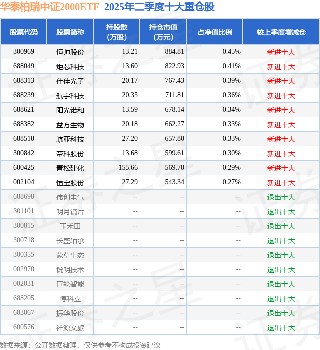 根据2025基金半年报公募基金重仓股数据,重仓该股的公募基金共1家,其中持有数量最多的公募基金为华泰柏瑞基金的华泰柏瑞中证2000ETF。华泰柏瑞中证2000ETF目前规模为19.84亿元,最新净值1.3168(9月18日),较上一交易日下跌1.1%,近一年上涨80.14%。该公募基金现任基金经理为柳军 李沐阳。柳军在任的基金产品包括:华泰柏瑞上证红利ETF,管理时间为2009年6月4日至今,期间收益率为137.48%;华泰柏瑞沪深300ETF,管理时间为2012年5月4日至今,期间收益率为111.31%;华泰柏瑞沪深300ETF联接A,管理时间为2012年5月29日至今,期间收益率为128.13%;华泰MSCI中国A股国际通ETF,管理时间为2018年4月26日至今,期间收益率为80.54%。李沐阳在任的基金产品包括:华泰柏瑞中证光伏产业ETF,管理时间为2021年1月6日至今,期间收益率为-23.96%;华泰柏瑞光伏ETF联接A,管理时间为2021年8月17日至今,期间收益率为-43.97%;华泰柏瑞中韩半导体ETF(QDII),管理时间为2022年11月2日至今,期间收益率为113.55%;华泰柏瑞纳斯达克100ETF(QDII),管理时间为2023年3月1日至今,期间收益率为98.69%。