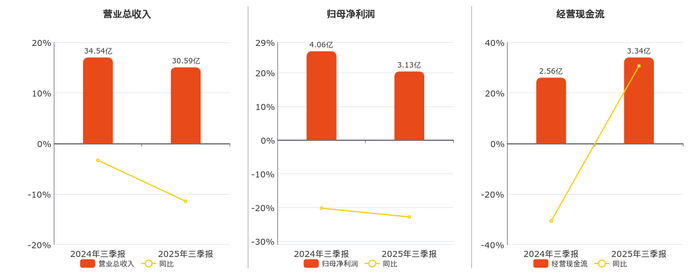 公司营业总收入为30.59亿元,在已披露的同业公司中排名第11,较去年同报告期营业总收入减少3.95亿元,同比较去年同期下降11.44%。归母净利润为3.13亿元,在已披露的同业公司中排名第6,较去年同报告期归母净利润减少9249.98万元,同比较去年同期下降22.81%。经营活动现金净流入为3.34亿元,在已披露的同业公司中排名第8,较去年同报告期经营活动现金净流入增加7838.61万元,同比较去年同期上涨30.66%。