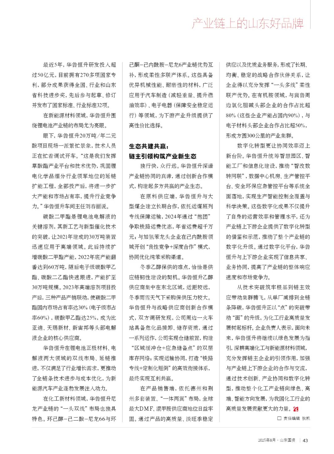 从技术突破筑牢根基到链主效应带动集群腾飞,从单厂减排到全链条降碳,华鲁恒升正以“点”的突破带动“面”的升级,为化工行业高质量发展树起标杆。企业负责人表示,面向未来,华鲁恒升将继续以绿色发展为指引,深耕高端化工与新能源材料领域,充分发挥链主企业的引领作用,加强与产业链上下游企业的合作与交流,通过技术创新、产业协同和数字化转型,推动整个化工产业链向绿色、高端、智能方向发展,为我国化工行业的高质量发展贡献更大的力量。
