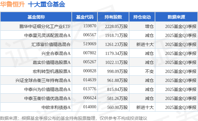 根据2025基金Q3季报公募基金重仓股数据,重仓该股的公募基金共126家,其中持有数量最多的公募基金为鹏华基金的鹏华中证细分化工产业ETF。鹏华中证细分化工产业ETF目前规模为185.44亿元,最新净值0.7544(11月7日),较上一交易日上涨3.3%,近一年上涨20.7%。该公募基金现任基金经理为闫冬。闫冬在任的基金产品包括:鹏华中证800地产指数(LOF)A,管理时间为2019年4月30日至今,期间收益率为-36.41%;鹏华中证A股资源产业指数(LOF)A,管理时间为2019年11月20日至今,期间收益率为163.35%;鹏华中证光伏产业ETF,管理时间为2021年2月22日至今,期间收益率为7.24%;