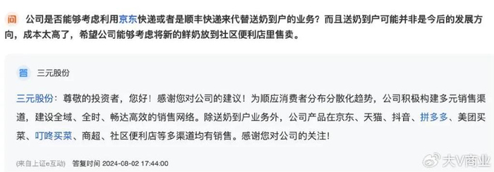 投资者曾经询问三元股份,是否考虑用京东快递或者顺丰代替送奶到户,或者放到社区便利店。