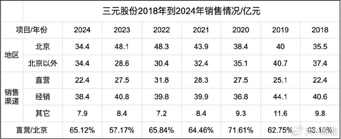2018到2023年北京地区的销售额分别是35.5亿元、40亿元、38.4亿元、43.9亿元、48.3亿元、48.1亿元,到了2024年直线下滑到了34.4亿元。