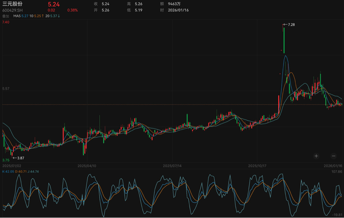 二级市场方面,2025年以来,三元股份股价始终在4元/股至5元/股左右震荡,直到11月,受奶皮子糖葫芦概念影响,公司迎来大幅走高。11月13日,三元股份股价走出四连板,当天收报7.28元/股(不复权,下同),市值一度被推高至110亿元。此后,公司股价回调,截至2026年1月19日收盘,该股报5.25元/股,市值较高点回撤约28%,为79亿元。