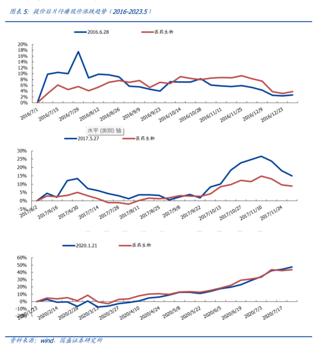 相对医药生物指数,2016和2017年提价效应产生的超额效益在提价后1个月左右达到峰值。2022年由于宏观环境较为复杂,所以短期没有产生太大拉动,但拉长看还是跑赢了医药指数。