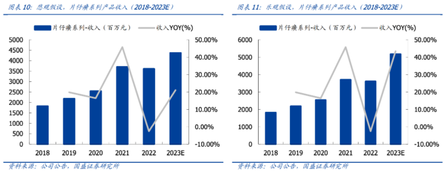 从对公司整体业绩弹性的增加来看,与2022年相比,悲观假设下,2023年提价有望为公司带来 9%的营收增长(2022年公司总营收86.94亿元,片仔癀提价有望同比带来7.60亿元的收入增加)与19%的净利润增长(2022年公司净利润25.23亿元,片仔癀提价有望同比带来 4.90 亿元的净利润增加);