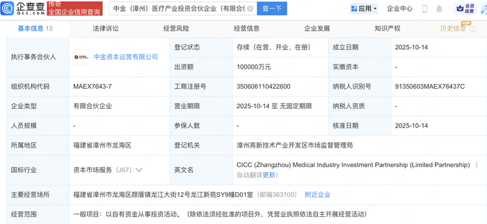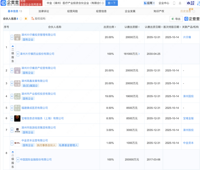 企查查APP显示,近日,中金(漳州)医疗产业投资合伙企业(有限合伙)成立,出资额10亿元,经营范围包含:以自有资金从事投资活动。企查查股权穿透显示,该企业由片仔癀(600436)全资子公司漳州片仔癀投资管理有限公司、中金公司(601995)全资子公司中金资本运营有限公司等共同出资。