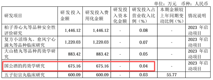 但源媒汇翻阅财报后发现,同仁堂仅在2023年披露了一个与酒相关的研发项目,该项目研发投入为675万元,主要用于国公酒的药效学研究。京东大药房上的同仁堂旗舰店显示,该酒1瓶*328ml售价为24元,宣传图片上有散风祛湿、舒筋关节疼腰腿痛、手足麻木等关键词。