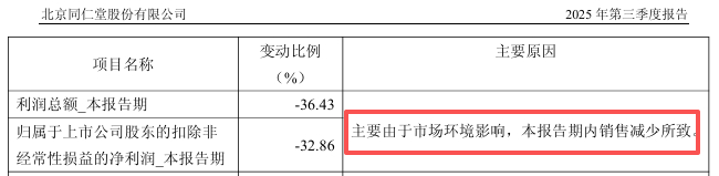 多重因素影响下,同仁堂2025年前三季度的业绩出现明显下滑,财报中的解释是:市场环境的影响导致销售减少。这也从侧面印证了同仁堂长期依赖传统产品与线下渠道的经营模式,在行业变革与政策调整中抗风险能力较弱。