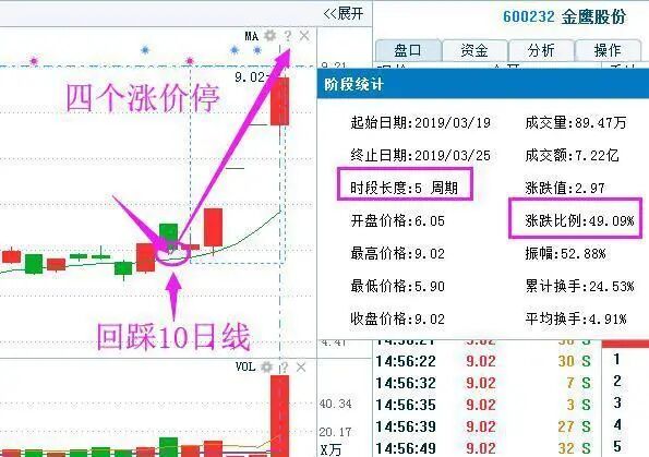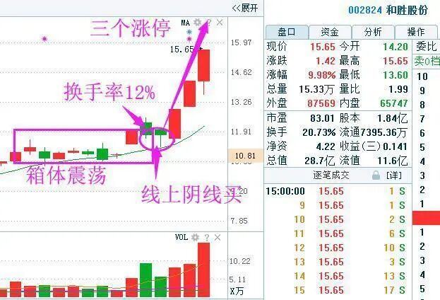 再来看上图的和胜股份,就是通过箱体突破战法选出来的,在3月19日换手率达到12%以上,股价突破箱体,,量能也是上涨放量,下跌缩量,资金持续的在流入,果断的选出来,之后连续的三上涨停。