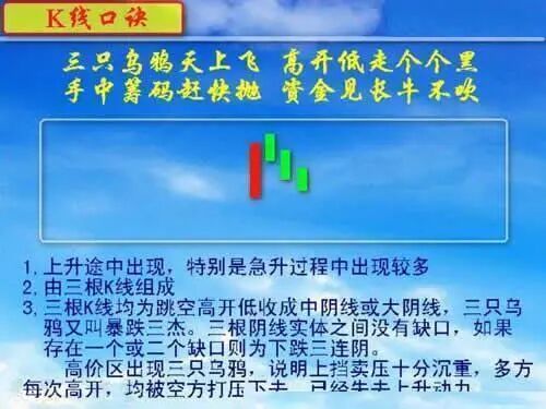 9、三只乌鸦天上飞,高开低走个个黑;手中筹码赶快抛,资金见长牛不吹。