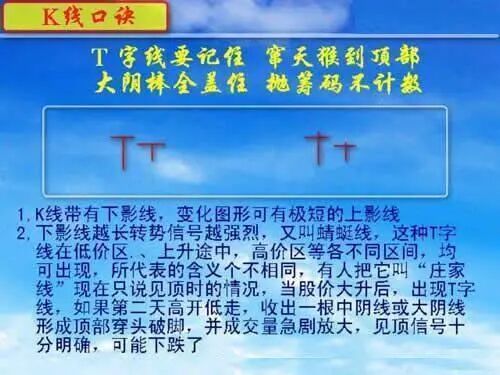 6、T字线要记住,窜天猴到顶部;大阴棒全盖住,抛筹码不计数。