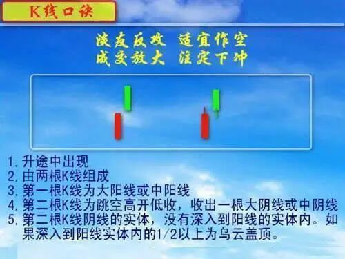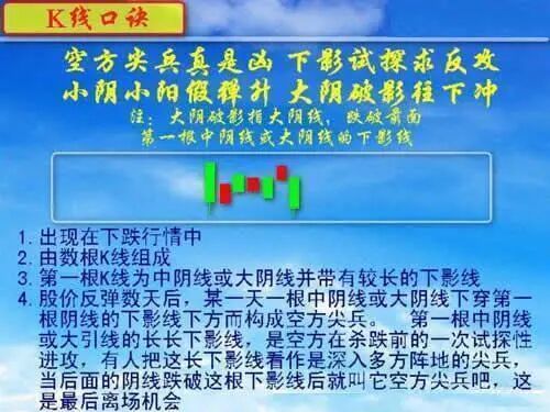 2、空方尖兵真是凶,下影试探求反攻;小阴小阳假弹升,大阴破影往下冲。(注:大阴破影是指大阴线,跌破前面第一根中阴线或大阴线的下影线)