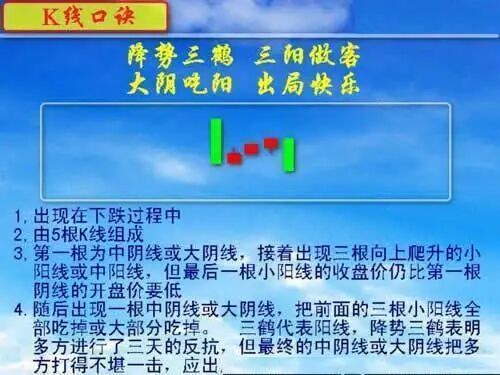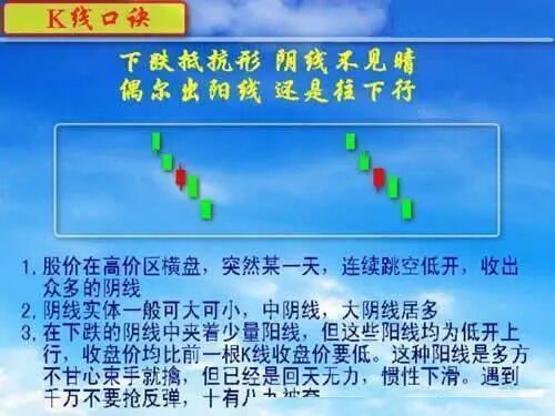 4、下跌抵抗形,阴线不见晴;偶尔出阳线,还是往下行。