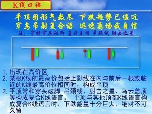 7、平顶图形气数尽,下跌趋势已逼近;穿乌吊射符合语,迅速撤场我自信。(注:穿乌吊射是指,穿头破脚、乌云盖顶、吊颈线、射击之星)