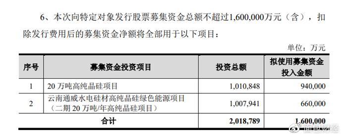 此次定增的募集资金将投向两个高纯晶硅项目,其中20 万吨高纯晶硅项目拟使用94亿募投资金;云南通威水电硅材高纯晶硅绿色能源项目拟使用66亿募投资金。