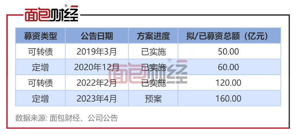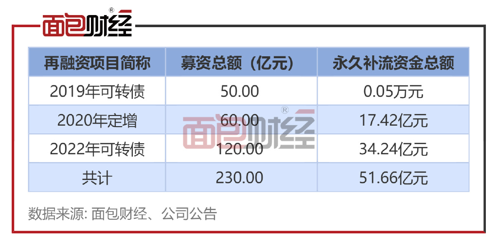 截至2023年3月31日,此前3次再融资募投项目均已建设完成,2次可转债项目均有节余募集资金用于永久补流,包括募投补流资金在内,公司累计51.66亿元用于永久性补流,占募资总额约22%。